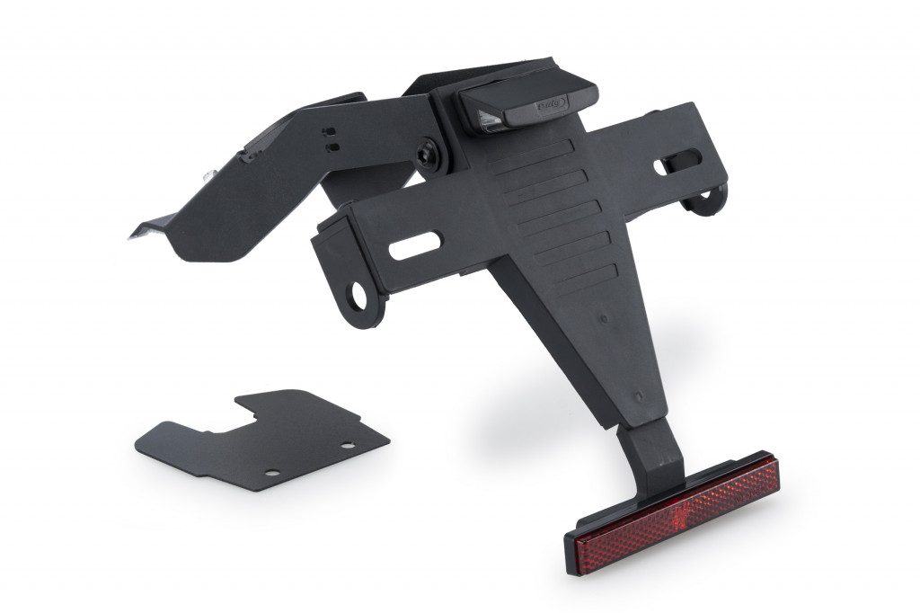 Replace your motorcycle's original license plate holder with the Puig license plate support, which, thanks to its elevated position, provides a sporty look to your bike. The set combines steel parts with an epoxy-painted finish and polyamide elements, achieving a significant weight reduction compared to the original holder.