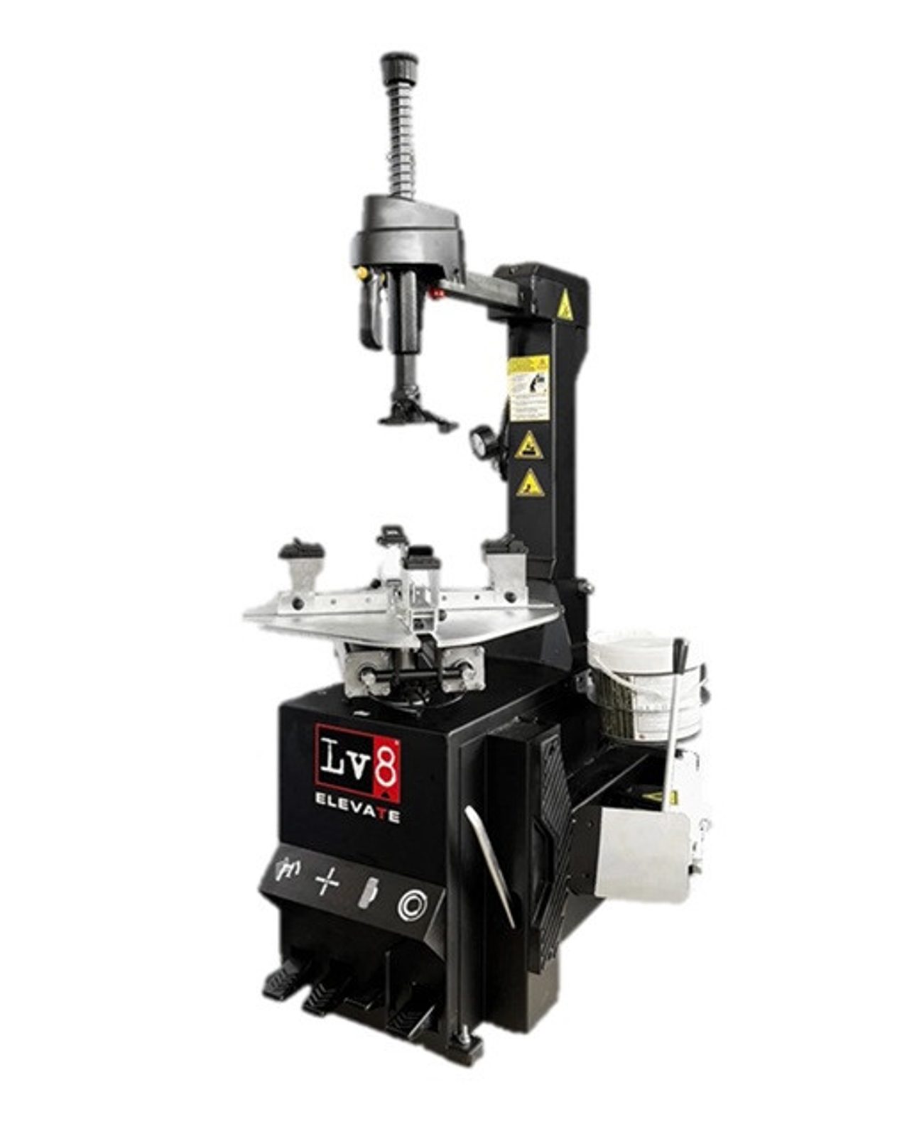 Automatic tyre changer with automatic tilting column and two speed chuck rotation.