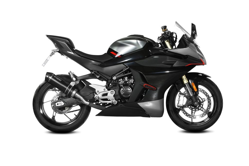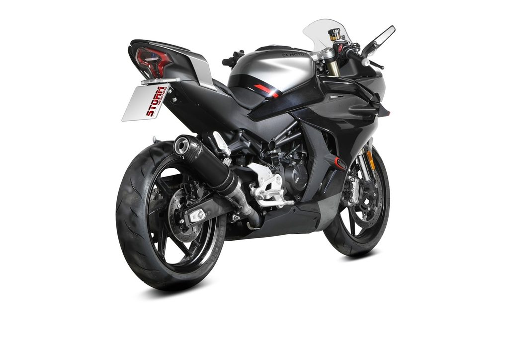 The GP exhaust is a short, round-shaped silencer inspired by racing bikes.