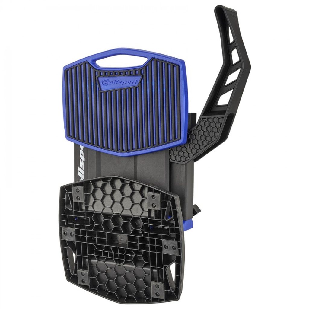 Polisport Zvedací stojan je první hybridní stojan (vyrobený z plastu a kovu), který je zároveň zvedací a skládací. Pomocí zvedací páky zvednete motocykl s minimálním úsilím. Má pevnou a odolnou strukturu, která je zesílená kovovým rámem. Díky tomu má stojan nosnost až 200 kg. Vrchní část je vyrobena z gumového kompozitu, který zajišťuje stabilitu motocyklu. Úložné přihrádky se hodí na odložení nářadí při údržbě motocyklu