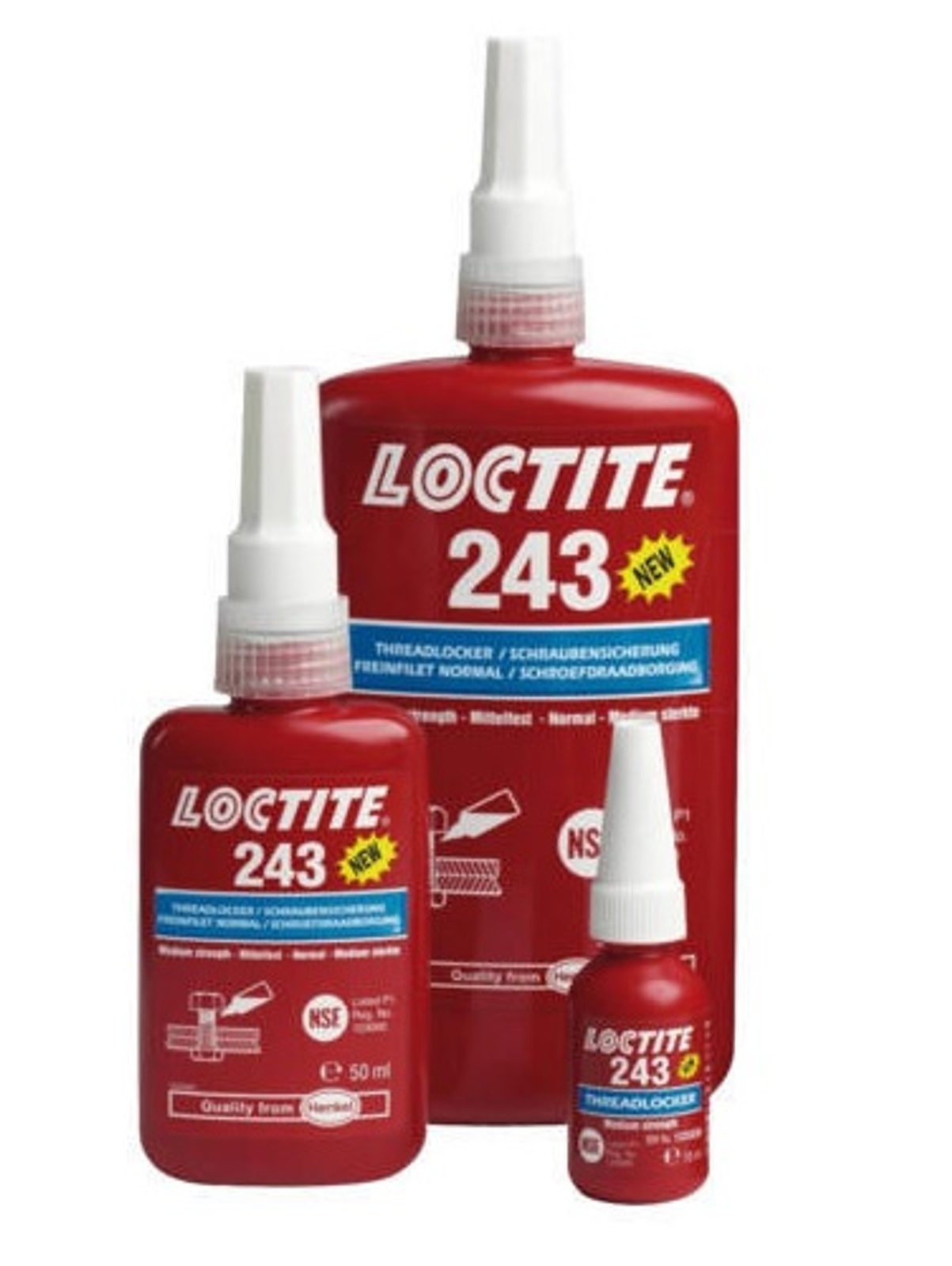 LOCTITE 243 je univerzální zajišťovač závitů se střední pevností spoje. Tento zajišťovač závitů zajišťuje a utěsňuje šrouby, matice a svorníky a předchází tak uvolňování vlivem vibrací. Tento produkt funguje na všech kovech, včetně pasivních podkladů jako je nerezová ocel nebo hliníkové a pokovené povrchy. Snáší mírné znečištění průmyslovými oleji, např. motorovými oleji, antikorozními oleji a řeznými kapalinami.