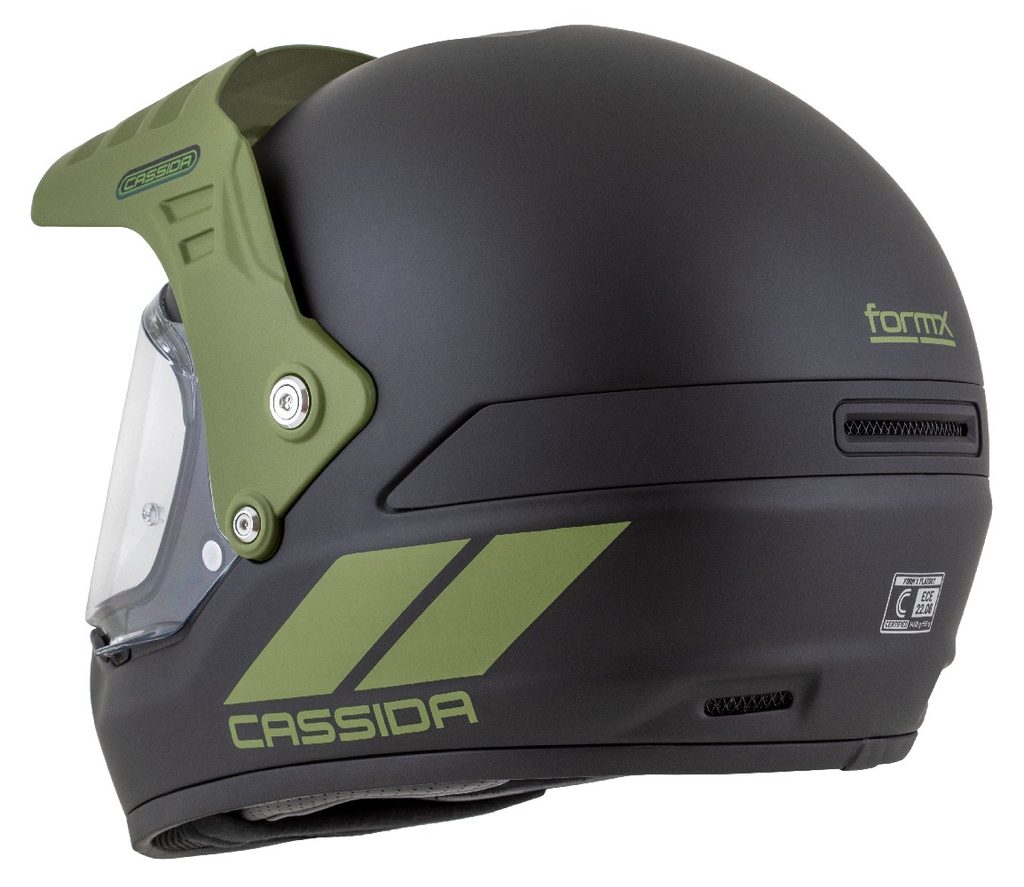 The FormX Helmet is a full-face helmet with a fiberglass shell and a removable peak. The ability to configure it either as a classic full-face helmet without the peak or with a peak and no visor makes it a highly versatile and stylish piece of protective gear.