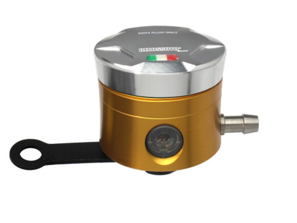 Accossato CNC-worked brake fluid reservoir, capacity of 25 cm3, horizontal oil spill. Straight braket provided. You can choose the colour match of the