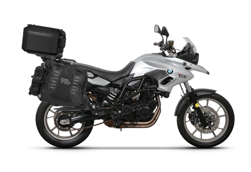 The ADVENTURE TERRA SHAD kit includes a set of TR40 off-road saddlebags and a 4P SYSTEM mounting kit for fastening and Top aluminum case TR55 PURE BLACK with TOP MASTER mounting kit and Top case standard plate.