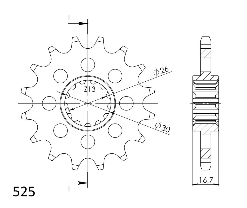 Every sprocket has weight reduction, with radial holes or radial slots (Forged models only) .