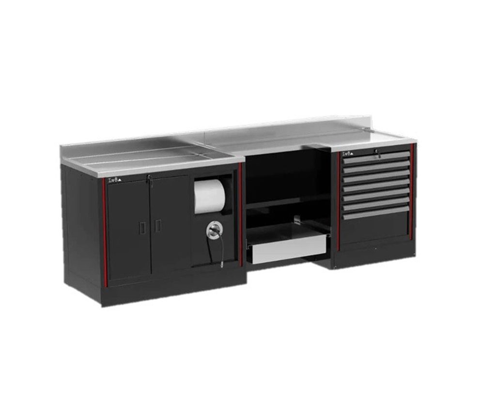 The first workstation to operate on every kind of motorcycle suspension, designed and created by the LV8 technicians and designers in collaboration with one of the most important suspensions manufacturers. L. 2800 mm configuration with stainless steel tank and top, without grids.