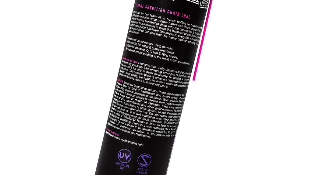 Muc-Off Wet Chain Lube was developed by our team of in-house boffins to provide maximum protection, no matter what mother nature can throw at your chain! The polymer formula penetrates deep into the chains links, to reduce wear and friction to a minimum in even the harshest of conditions. Our non-drying hydrophobic lubricant film sticks to every link even during a long, rain soaked ride! Rest assured that Muc-Off's Biodegradable Chain Cleaner will remove it quickly when the time does come for a clean and re-application!