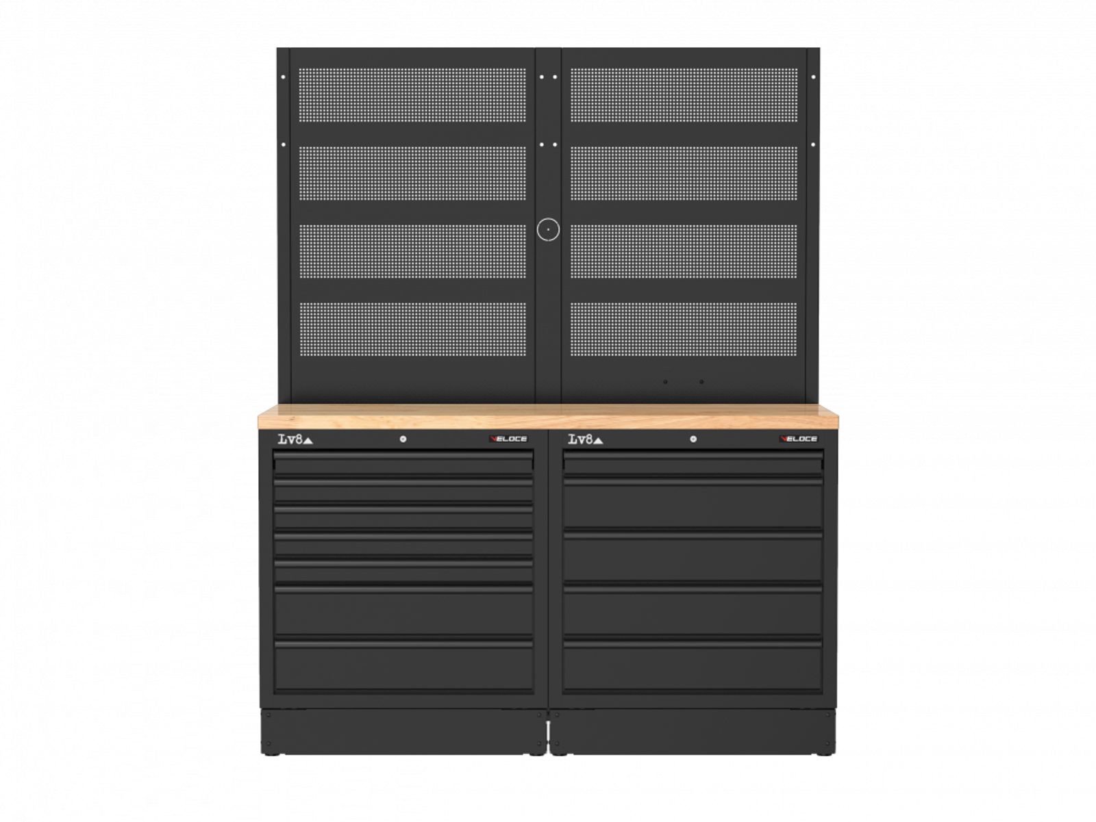 Workbench L. 1600 mm configured with 7-drawer cabinet and 5-drawer cabinet with key lock. Wooden top, double perforated tool holder panel with provision for an electric socket. Also available in stainless steel or melamine top versions.