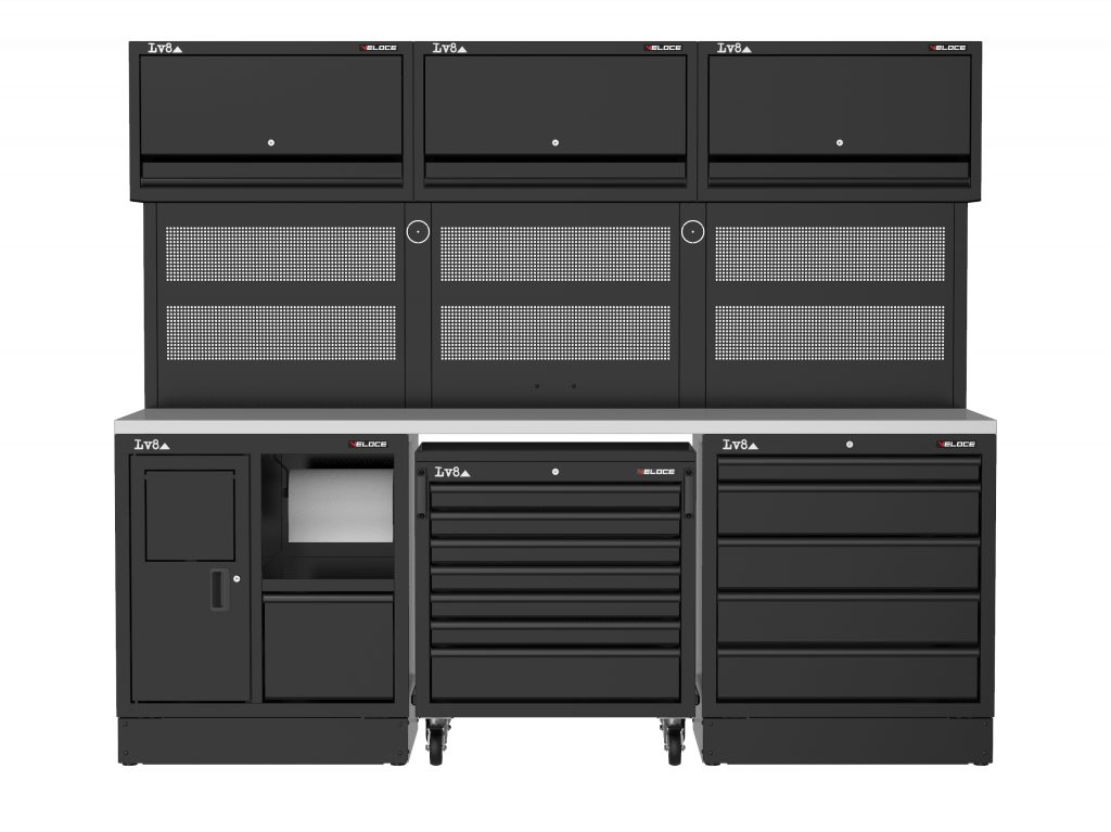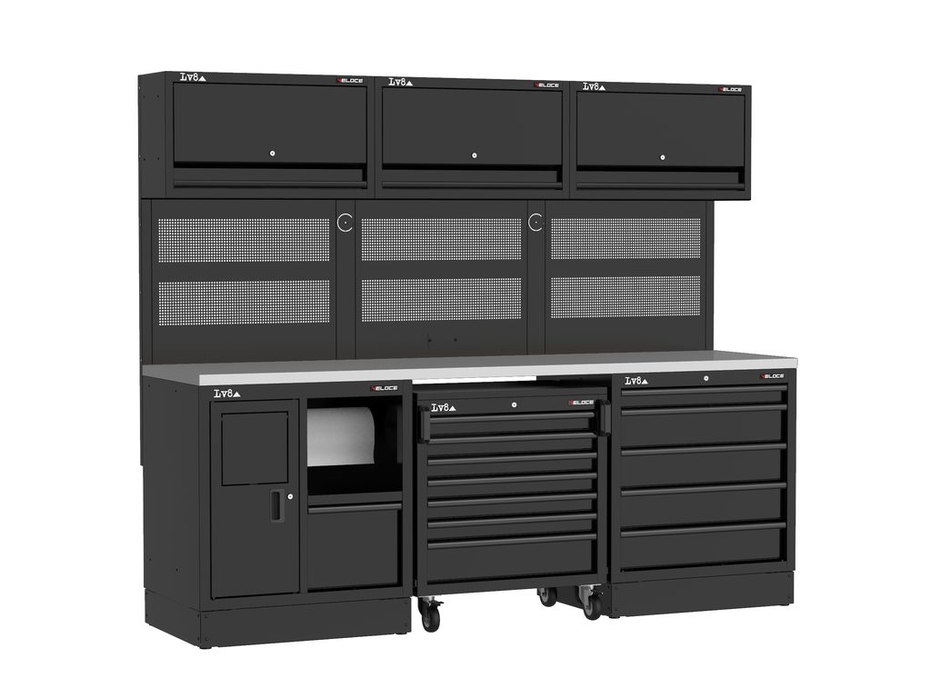 Workbench L.2400 mm with service cabinet with paper compartment and storage drawer, 7-drawer storage trolley and 5-drawer cabinet with key lock. Wooden top, perforated tool holder panels with 3 wall storage cabinets and provision for an electric socket. Also available in stainless steel or melamine top versions.